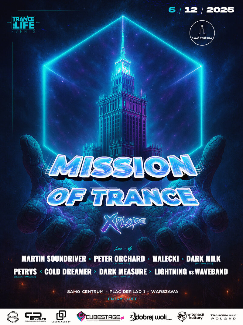 Get ready for an unforgettable night! Mission Of Trance: Xplode is not just another party – it’s a musical journey through the essence of trance, where rhythm, light and emotion merge into one powerful experience. On December 6, 2025, the heart of Warsaw will pulse to the sounds of uplifting, tech, classic, psy and progressive trance — all united in one explosive night of euphoria and energy.